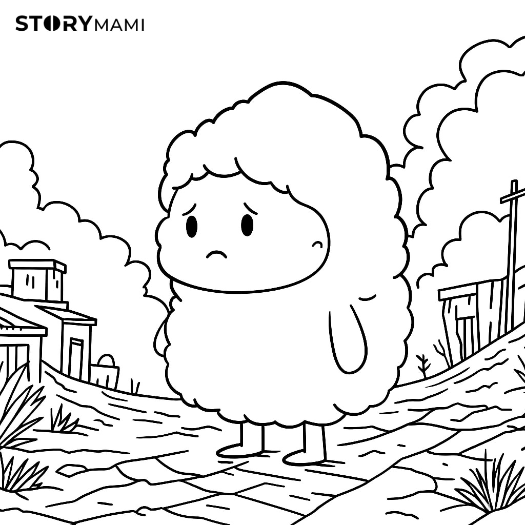 故事中,因為天氣太乾燥了,小白雲總是又白又輕,身體裡沒有水氣,所以沒辦法為鎮上的人們下雨。聽到大家的抱怨,他心裡覺得好難過。