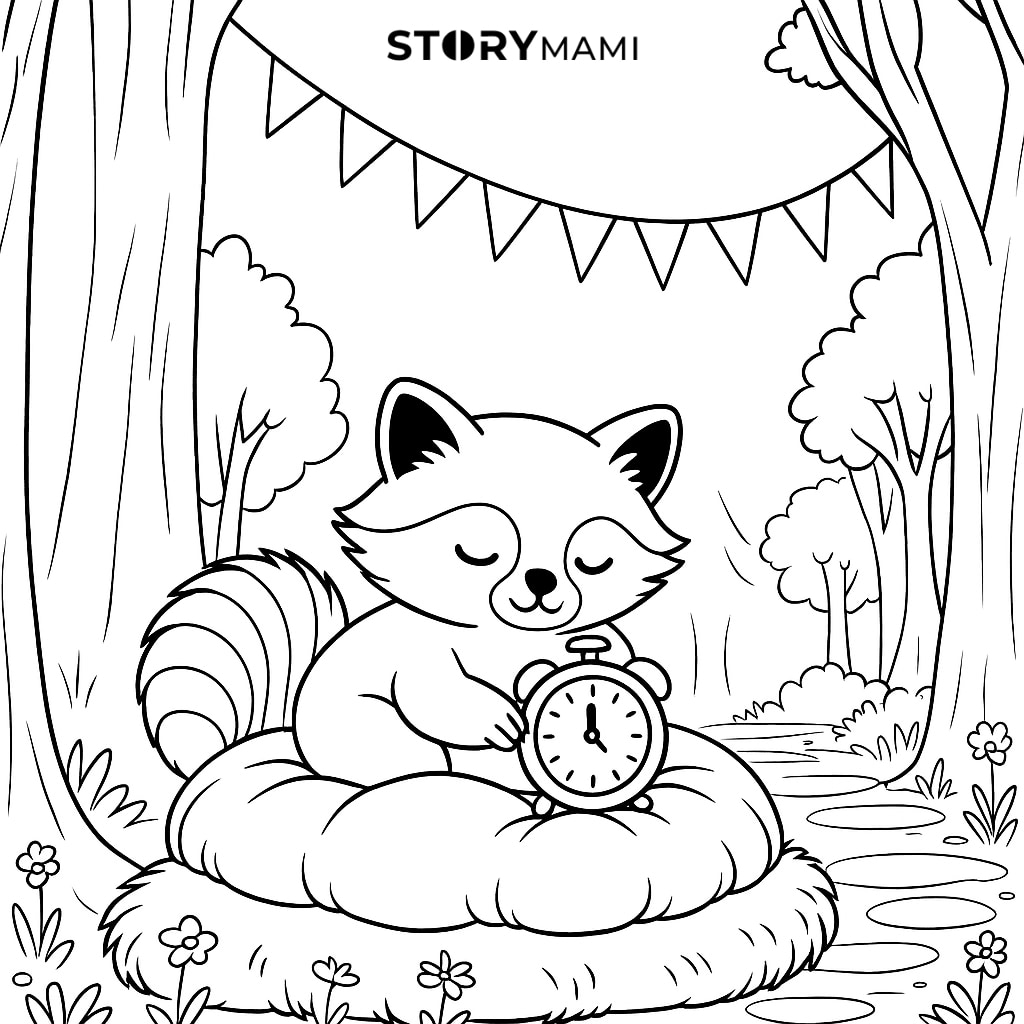 故事中,小浣熊因為太愛賴床,結果錯過了最期待的生日派對。最後,他明白了時間不會等人,改掉了賴床的壞習慣,變成一隻準時的小浣熊。
